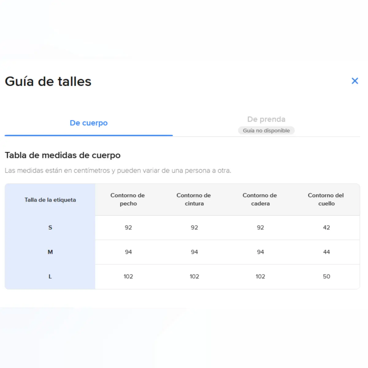 Talla: S Contorno de pecho: 92 Contorno de cintura: 92 Contorno de cadera: 92 Contorno del cuello: 42