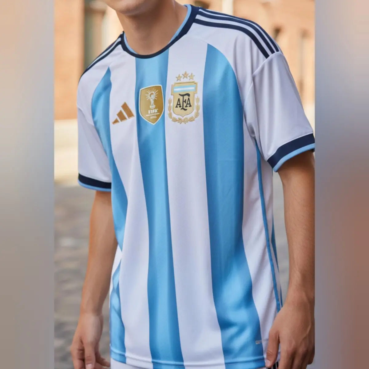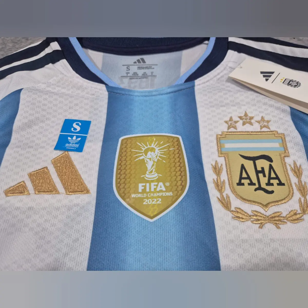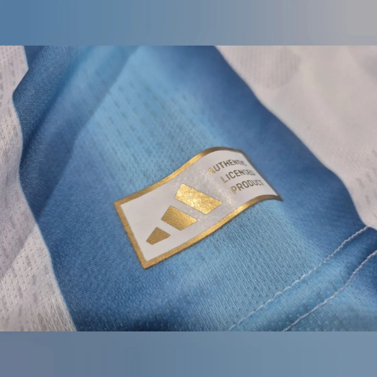 El diseño clásico celeste y blanco con el parche dorado de World Champions 2022 que recuerda la gloria eterna en Qatar.