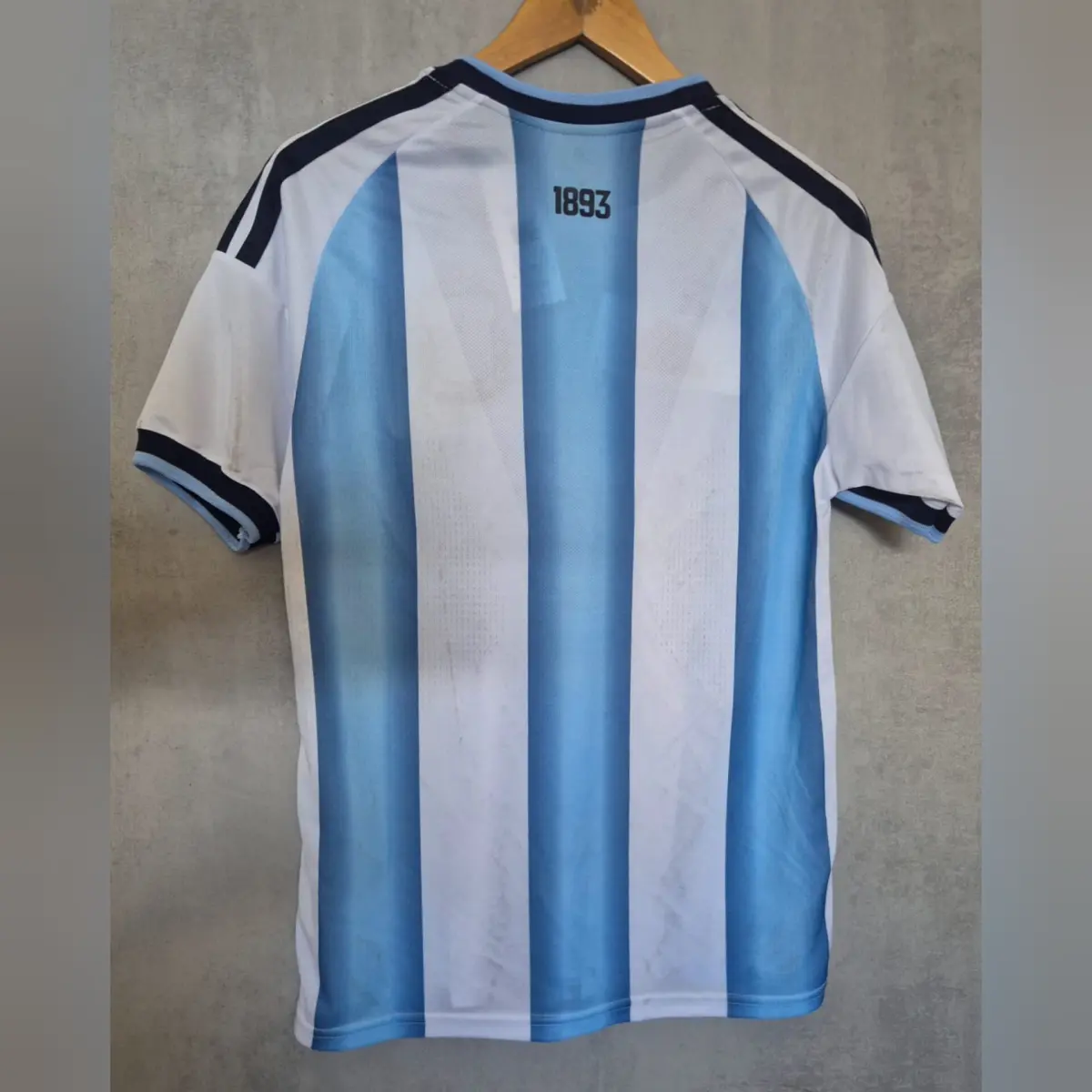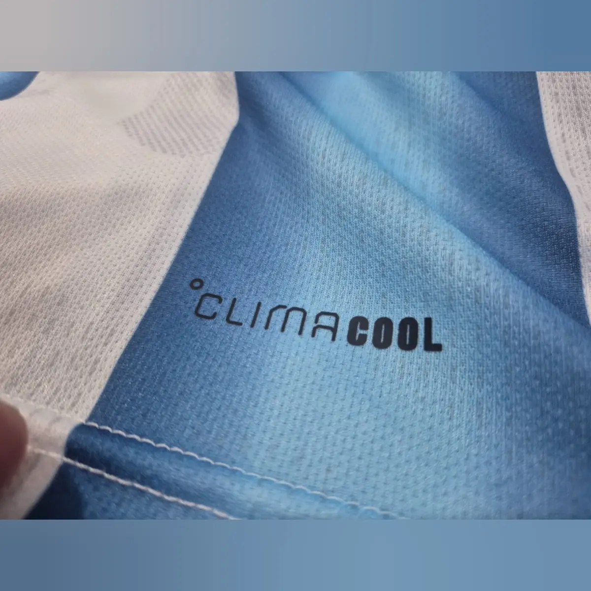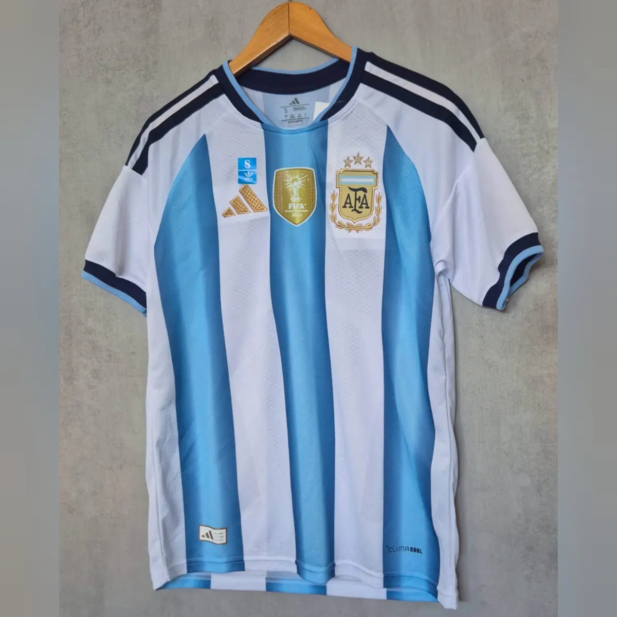 El diseño clásico celeste y blanco con el parche dorado de World Champions 2022 que recuerda la gloria eterna en Qatar.
