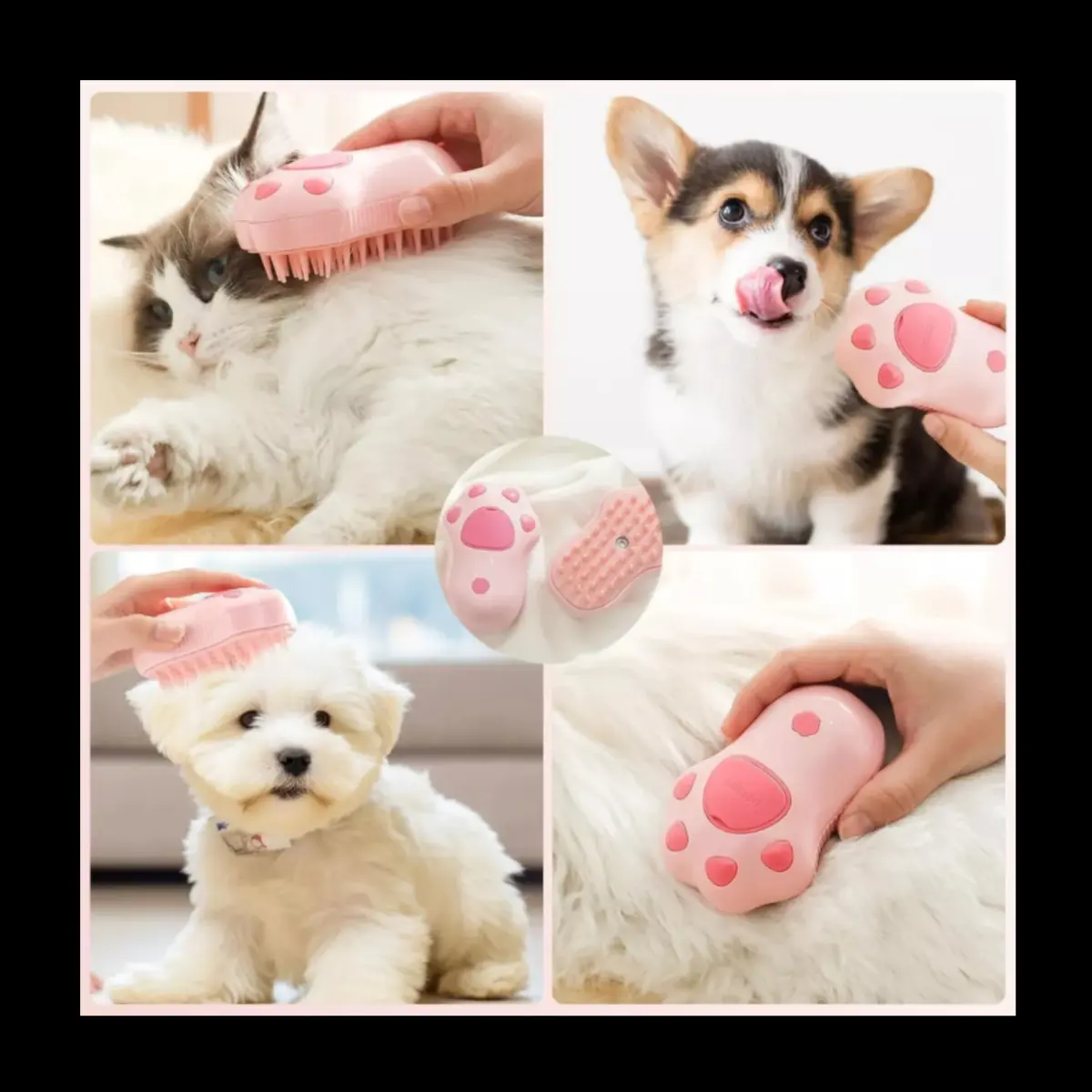Este dispositivo 3 en 1 no solo cepilla, sino que también masajea y utiliza vapor para eliminar la suciedad y el pelo suelto, mejorando la salud del pelaje de tus mascotas.